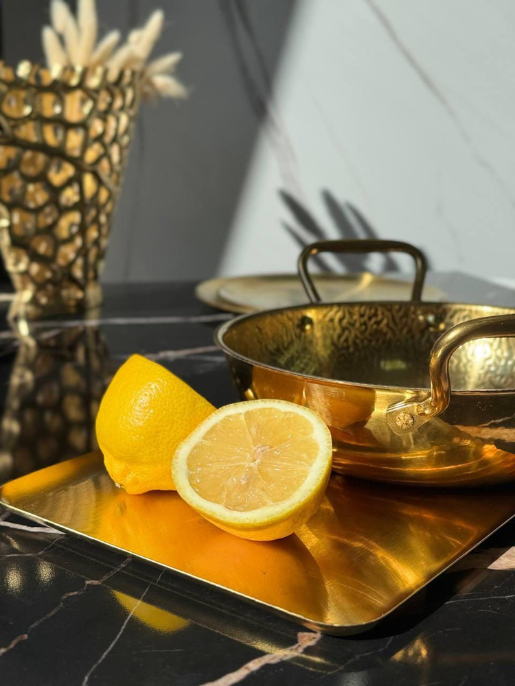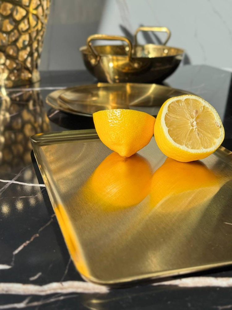 Прямокутна таця з золотим покриттям і матовою текстурою. Розмір 20х30 см дає достатньо місця для подачі напоїв, закусок або використання як декоративна основа. Ідеально поєднується з посудом серії “Голда”.