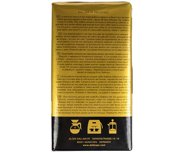 Щойно вловима кислинка в чудовому поєднанні з м'яким повним смаком кави легко зможе здивувати справжніх любителів кави. Середня обсмажування зерен арабіки, вирощених на землях Ефіопії, надала напою бездоганний багатий смак та досить інтенсивний, але дуже тонкий аромат. DALLMAYR Prodomo - особлива суміш, здатна задовольнити будь-які побажання, оскільки її якість відповідає всім вимогам справжньої гарної кави.