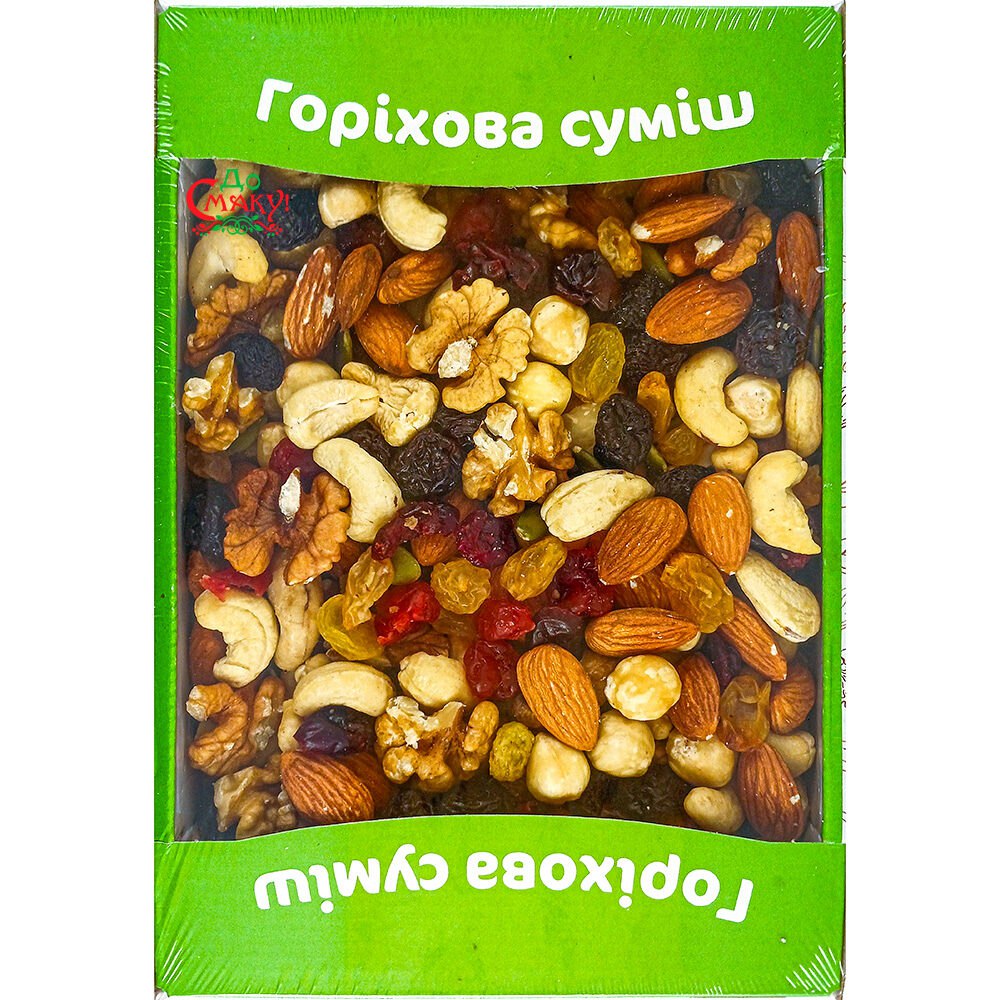 Горіховий мікс 500г - ядро горіха кешью, ядро горіха мигдалю, ядро горіха фундука смажене, ядро волоського горіха, журавлина в'ялена, вишня в'ялена, родзинки Чилі білий, родзинки Чилі чорні. Пропонуємо вам купити горіхи та замовити горіховий мікс у нашому інтернет магазині. Це комбінація різних видів горіхів, склад якої можна побачити на фото та описі.