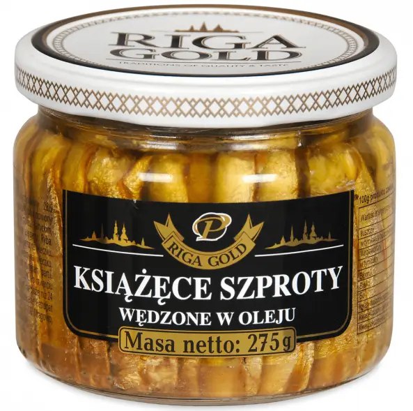 Шпроти в олії RIGA Gold – це найбільша фірмова страва латвійських консервів Riga Gold, неповторний смак і відносно низька ціна – ось ті особливості, які зробили їх такими популярними. Шпроти дикого вилову, копчені вільховим димом в банці 275 г, продукт без ГМО.