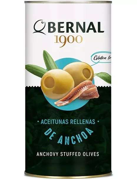 Зелені оливки Bernal, фаршировані анчоусом, є популярним продуктом серед шанувальників середземноморської кухні. Ці оливки відрізняються інтенсивним смаком, завдяки поєднанню ніжних зелених оливок та пікантного анчоуса всередині. Вони ідеально підходять для подачі як закуска, а також можуть бути використані в салатах, піці або інших стравах. Такий продукт має тривалий термін зберігання завдяки консервуванню в банці.