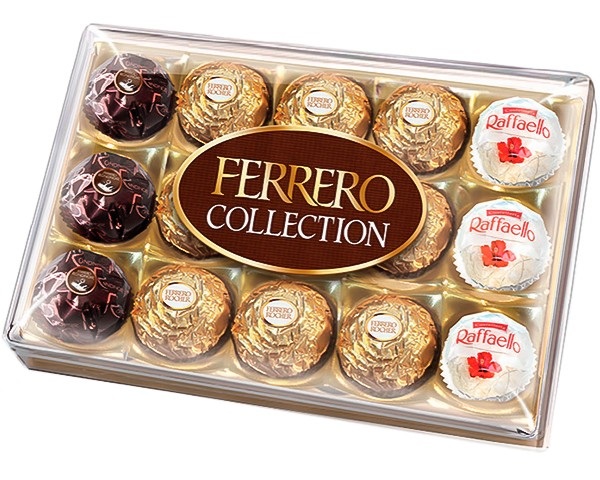 Цукерки Ферреро Роше Колекція – набір, що складається із трьох культових смаків італійського бренду. У коробці ви знайдете вафельні кульки Ferrero Rocher, вкриті молочним шоколадом з лісовим горіхом усередині, Ferrero Rondnoir у темному шоколаді та кокосові цукерки Raffaello із цілісним каліфорнійським мигдалем усередині. У багатій палітрі різноманітних смаків та текстур ви обов'язково знайдете свого фаворита. Ferrero Rocher Collection стане чудовим подарунком для справжнього ласуна. Солодощі з добірних інгредієнтів відмінно урізноманітнять ваше чаювання.