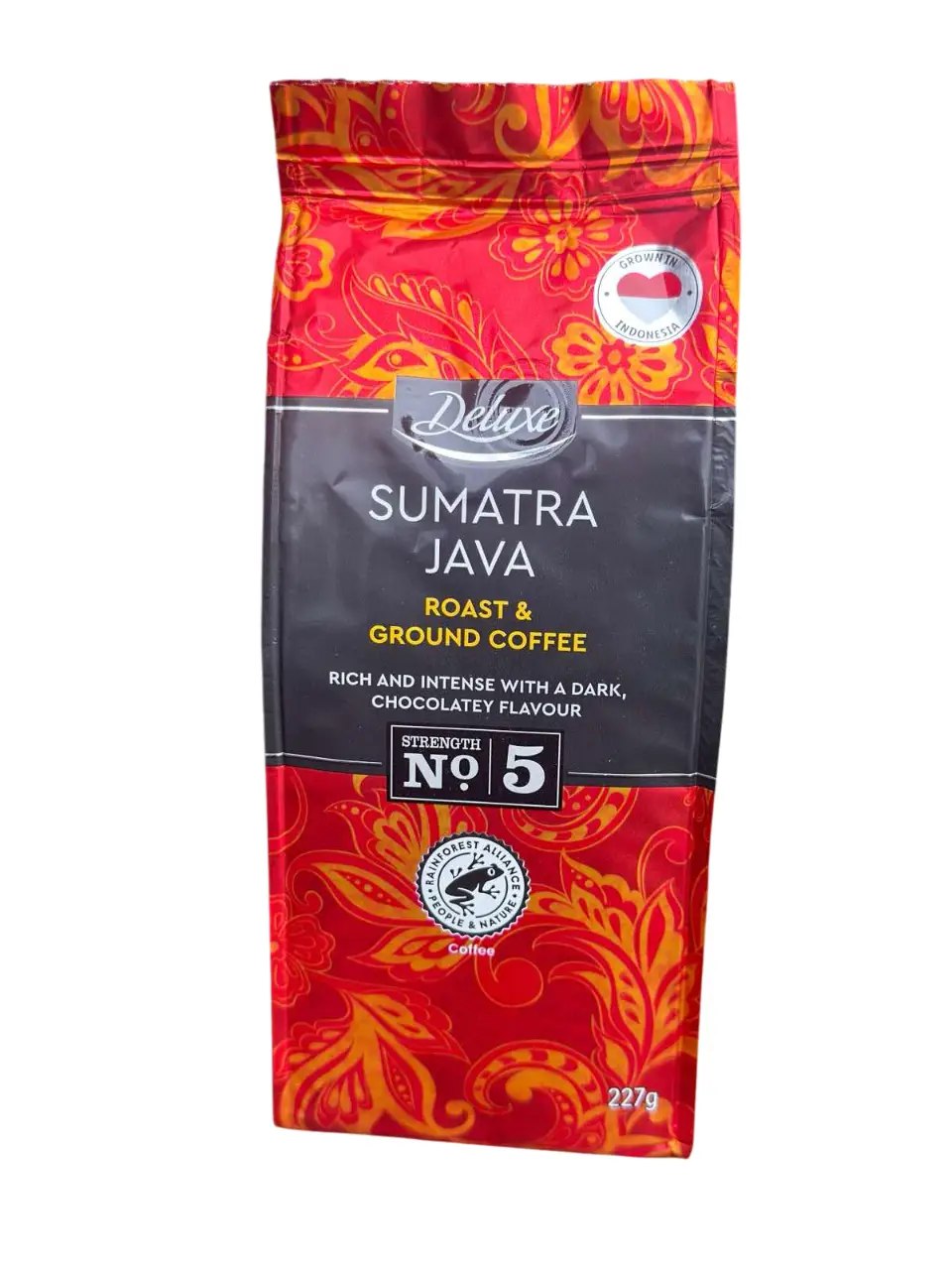 Ароматна кава Deluxe Sumatra Java створена з добірних зерен, вирощених на островах Суматра та Ява в Індонезії — регіонах, відомих своїми насиченими, глибокими смаками. Вона має виразний, повний смак із нотами темного шоколаду, прянощів і легкою землистою гірчинкою, без зайвої кислотності.