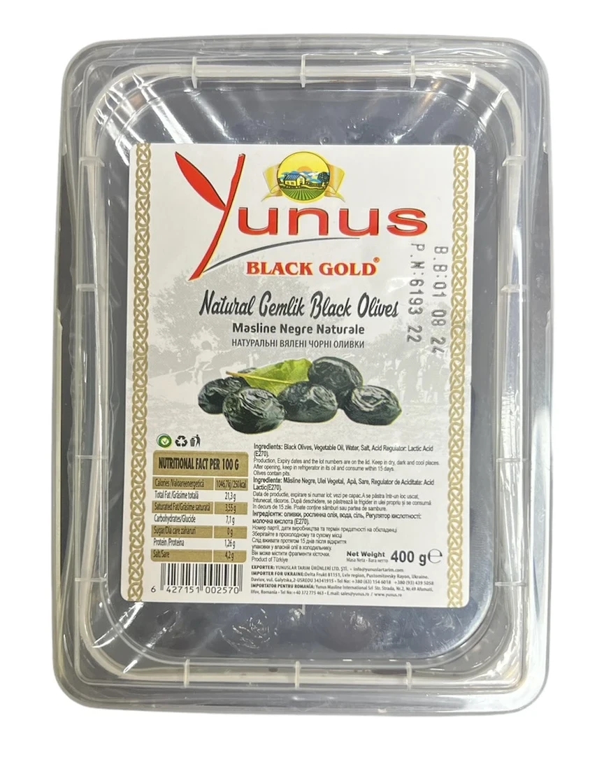Маслини з кісточкою фірми Yunus Туреччина . Чорні маслини консервовані містять велику кількість корисних вітамінів.Вони є природними антиоксидантами, що сприяє зміцненню імунітету та поліпшенню роботи серцево-судинної системи. Основа процесу в'ялення полягає в тому, що оливки зневоднюють шляхом природної сушки при температурі до 40 градусів за Цельсієм. В'ялення не повинно бути швидким і найкраще його робити під променями сонця. Саме в в'ялених оливках зберігається найбільша кількість корисних речовин і вітамінів. Якщо оливки приготовлені іншим способом (соління або консервація) містять у собі або сіль або луг, то в'ялені оливки ввібрали в себе тільки сонце і морський бриз.