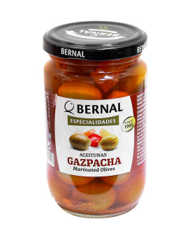 Мариновані оливки Bernal Especialidades Aceitunas Gaspacha випускаються з додаванням різних приправ, таких як червоний перець, морква, цибуля, часник і чилі. Традиційна розробка з кращої сировини, яка подобається всім любителям оливок і чудово поєднується з вибраними стравами, закусками та різноманітними салатами. Не містять глютен.