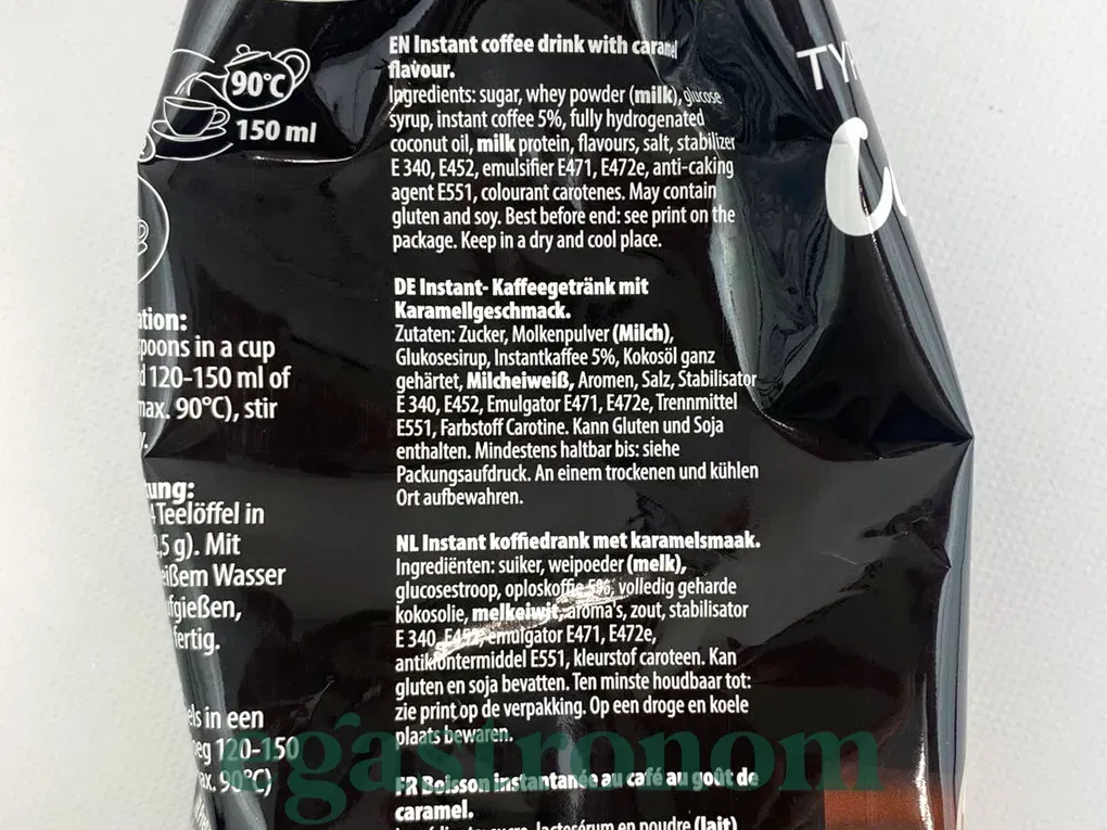 Капучино зі смаком карамелі - це різновид класичного кавового напою, який збагачений ароматом солодкої карамелі. Цей напій поєднує традиційну основу капучино, яка включає міцний еспресо та гаряче молоко з молочною піною, з додаванням екстрактів. Капучино є чудовим вибором для тих, хто любить кавові напої з оригінальним смаком. Цей напій ідеально підходить для ранкового сніданку або вечірнього релаксу, поєднуючи в собі класичний смак капучино та неповторний кармельний аромат. Покладіть 3-4 чайні ложки в чашку. Додайте 120-150 мл гарячої води (макс. 90°C), перемішайте і готово. Упаковка 1кг розрахована приблизно на 80 порцій. ТОП запити