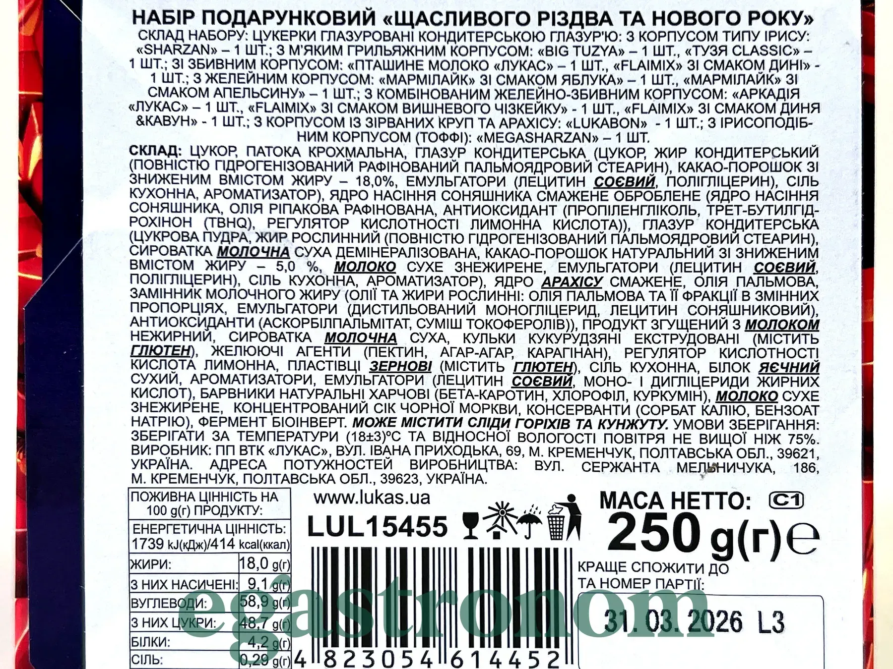 Створіть справжню казку під ялинкою разом із святковим набором від LUKAS! Усередині яскравої подарункової коробки на вас чекає асорті улюблених солодощів: глазуровані цукерки, ніжні мармелади, хрусткі корпусні цукерки та міні-смаколики з різними начинками. Кожен шматочок — це маленьке різдвяне диво, яке дарує тепло, святковий настрій і миттєве повернення у дитинство.
