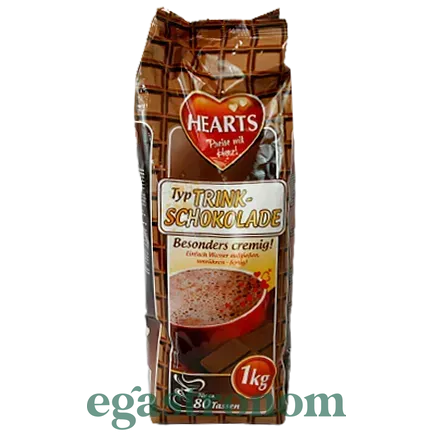 Смачний гарячий шоколад Hearts. Просто заповніть чашку гарячою водою і насолоджуйтеся. Напій має густу консистенцію, що стійкий аромат, високу оксамитову пінку. Склад: цукор, молочна сироватка, масло какао, сироп глюкози, кокосове масло, молочний білок, загущувач, ароматизатор шоколад. Спосіб приготування: 12,5 г порошок залити 150 мл кип'яченої води і розмішати. ТОП запити