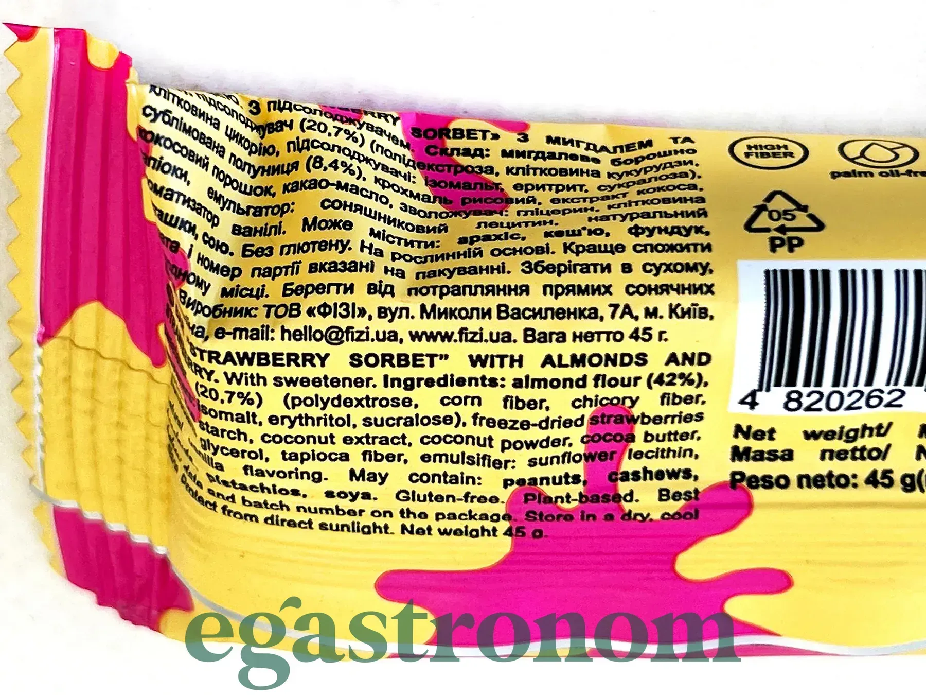Батончик полуниця з мигдалем (без глютену) Фізі Fizi strawberry sorbet 45g 10шт/ящ