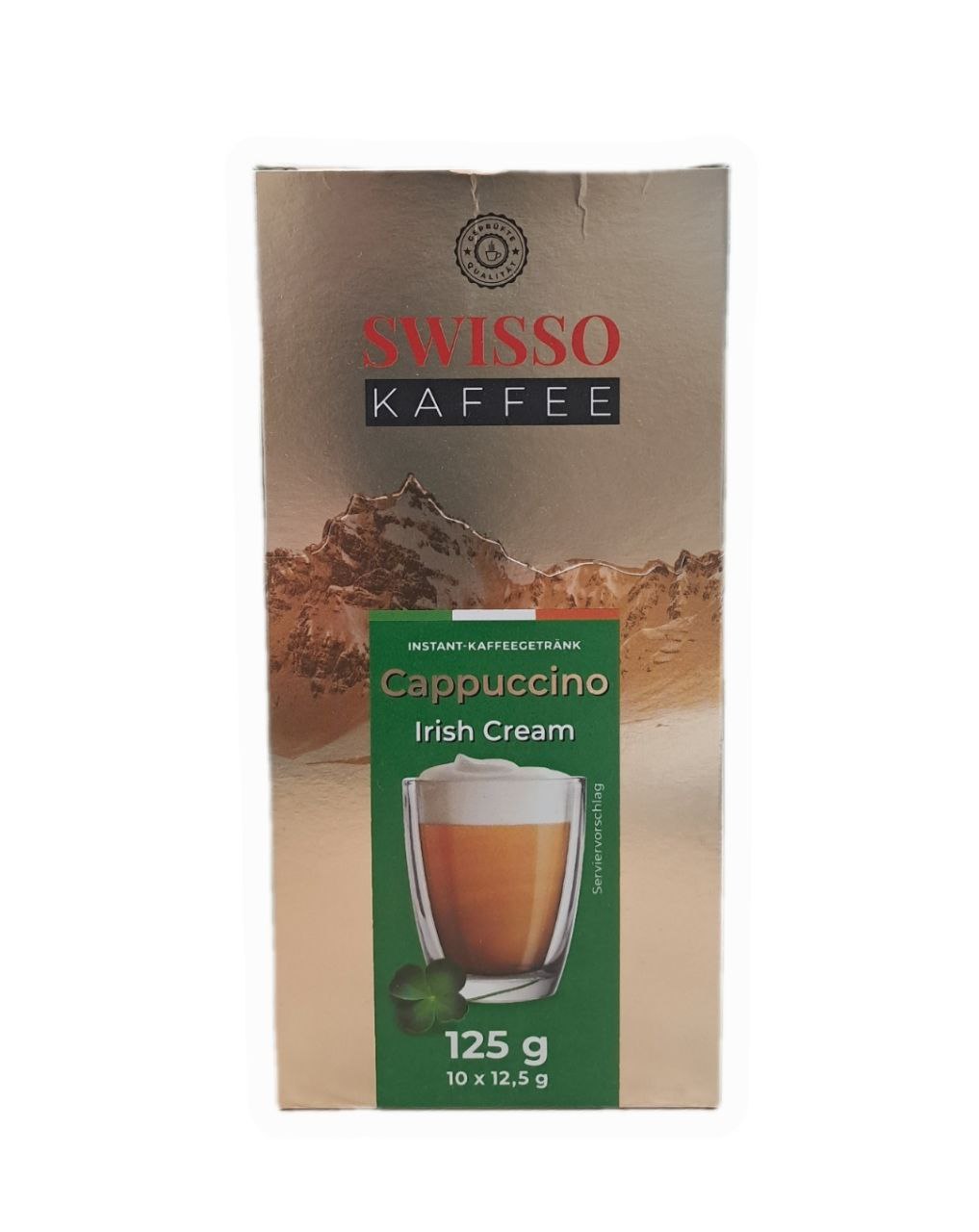 Капучино в стіках Swisso Irish Cream, 125 г (10×12.5 г) — ароматний та витончений напій у зручних порційних стіках, який поєднує класичний смак капучино з ніжними вершковими нотами ірландського крем-лікеру. Ідеальний варіант для швидкого приготування смачного та ароматного кавового напою без зайвих зусиль.