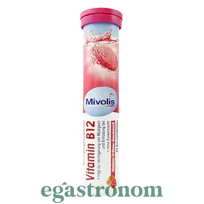 Шипучі таблетки - вітаміни Mivolis Vitamin B12. З малиново-полуничним смаком. Вітамін B12 є важливим живильною речовиною, сприяє нормальному енергетичного обміну, нормальному виробництву еритроцитів і зменшує втому і стомлюваність. Без додавання цукру. Не містять лактозу і глютен. Ідеально підходить в якості щоденної харчової добавки. Добовий норма - 1 таблетка. ТОП запити Цукерки ціни Сир Порошок пральний Соєві соуси Підгузники дитячі Купити макарони Купити сир тофу