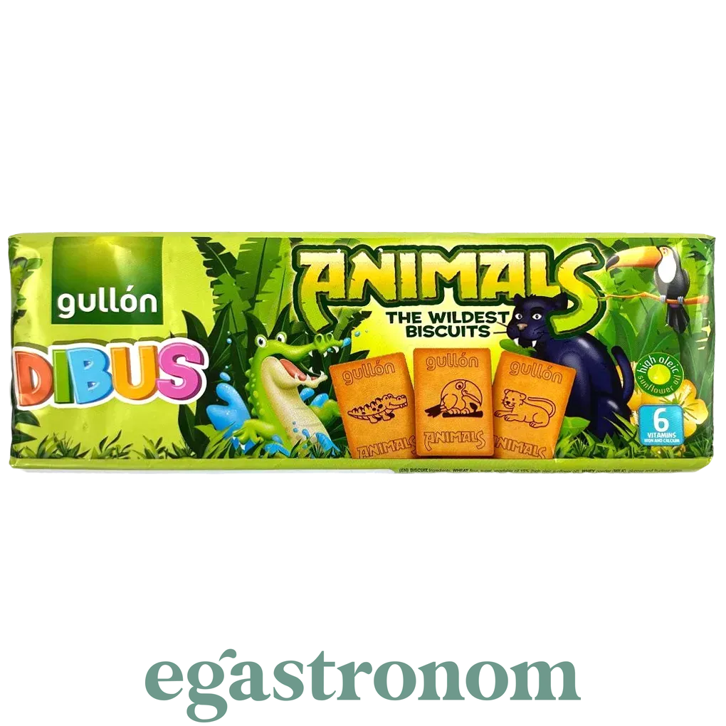 Бісквітне печиво Gullon Dibus Animals із зображенням тварин Іспанського виробництва. Прямокутні бісквітні печива гулон, на кожному із яких намальовані тварини, що мешкають в лісах, саванні, джунглях. Печиво виготовляється з турботою про дитячий організм, до його складу входить залізо, кальцій і 6 вітамінів, а також високоолеїнова соняшникова олія (замість пальмових жирів). Дитяче печиво Gullon Dibus Animals — корисне та смачне джерело вітамінів і мінералів. ТОП запити