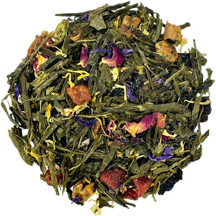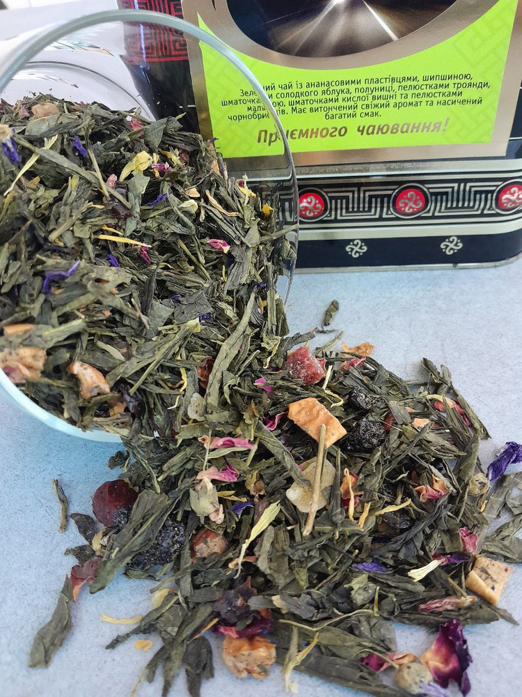 Зелений чай з ананасними пластівцями, шипшиною, шматочками солодкого яблука, полуниці, пелюстками троянди, мальви, шматочками кислої вишні та пелюстками чорнобривців.