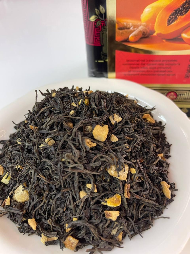 На основі добірного чорного чаю розкривається яскравий тропічний акорд — солодкувата папая додає м’якого сонячного відтінку, а апельсинова цедра вносить іскру свіжості. Імбир завершує композицію легкою пряністю, створюючи баланс між теплом і цитрусовою легкістю.