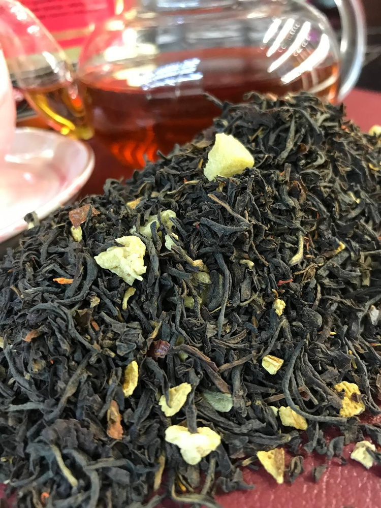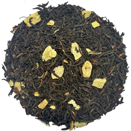 Чорний ароматизований чай "Королівський вибір" з шматочками і цедрою апельсина, пелюстками троянди і шипшиною. Має яскравий аромат стиглого апельсина.