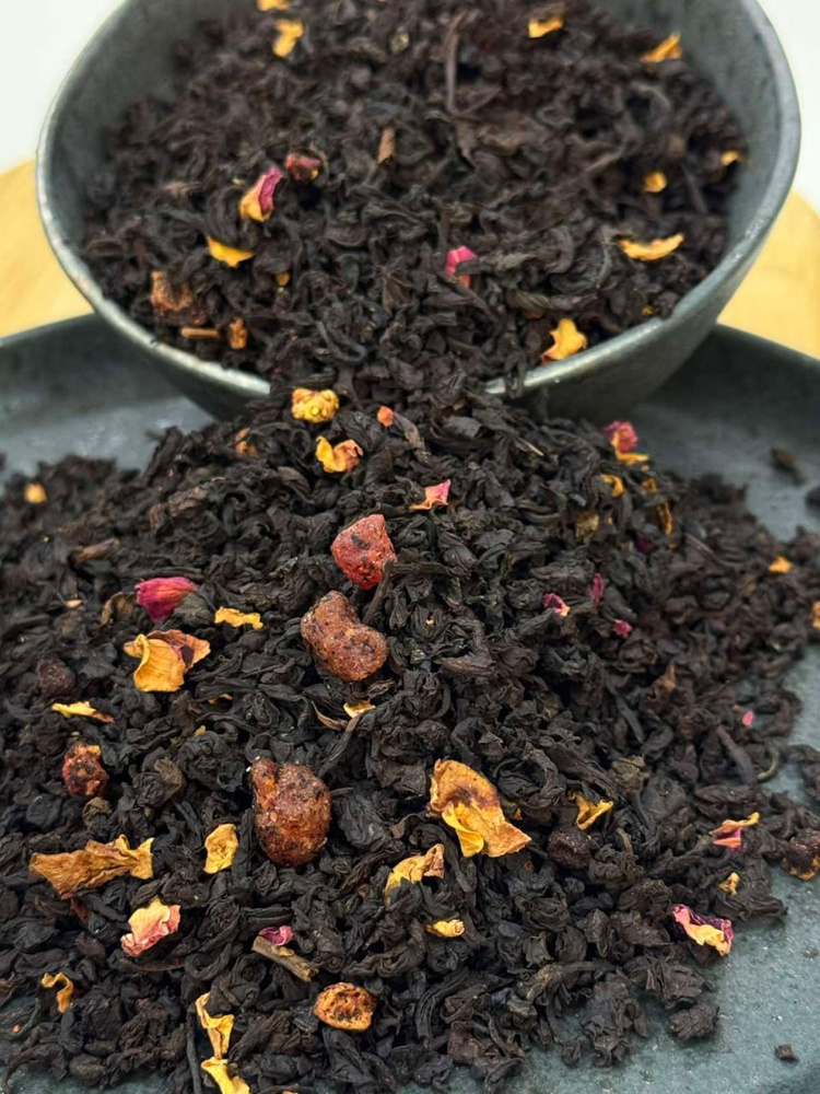 Насолоджуйтеся витонченим смаком та ароматом справжньої насолоди! Чорний полуничний чай із вмістом соковитих шматочків полуниці та ніжних пелюсток троянди створює унікальну гармонію смаку.
