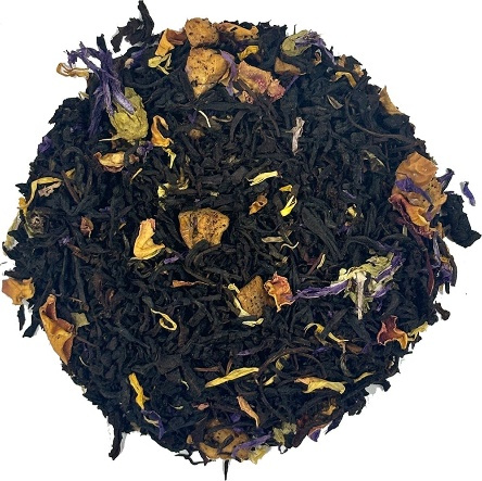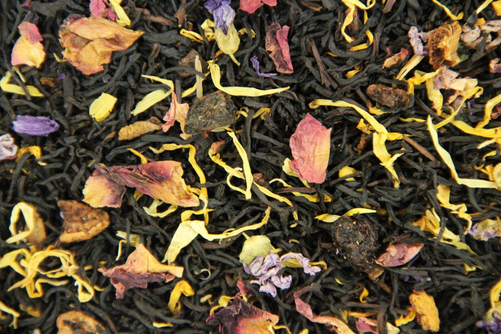 Чорний чай "Рецепт Клеопатри" ароматизований пелюстками мальви, соняшника та троянди, шматочками ананаса і родзинками.