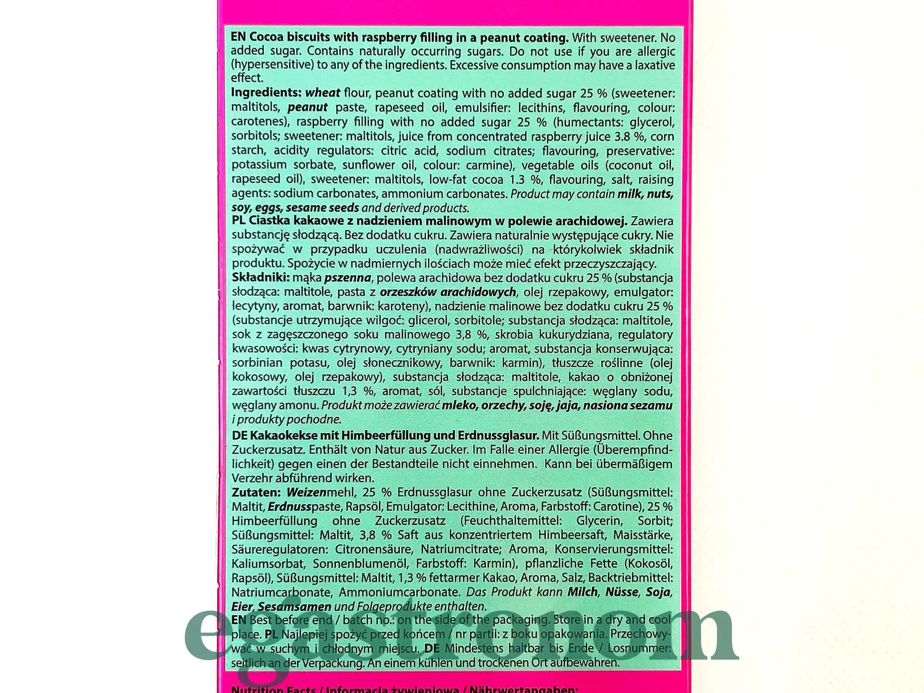 Ніжне какаове печиво з малиновою начинкою у глазурі з арахісової пасти. Без доданого цукру та пальмової олії, з яскравим поєднанням малини та арахісу для справжніх гурманів.