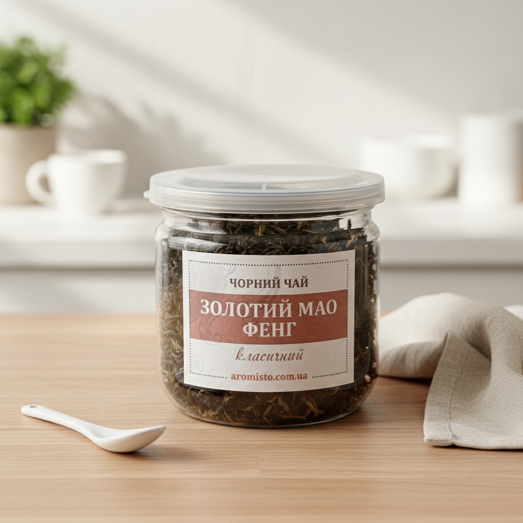 Золотий Мао Фенг — вишуканий китайський чорний чай, виготовлений переважно з ніжних, золотистих бруньок та молодого листя, зібраного вручну навесні. Цей чай славиться своїм м’яким, оксамитовим смаком та природною солодкістю. В ароматі відчуваються нотки меду, карамелі, квітів і легкий фруктовий відтінок. Смак надзвичайно делікатний, без гіркоти, з теплою медово-шоколадною базою і тривалим солодким післясмаком. Завдяки великій кількості бруньок чай має ніжну текстуру та багатий ароматичний букет. Спосіб заварювання: Традиційний (Гунфу або гайвань): Пропорція: 4–5 г чаю на 100–150 мл Температура води: 85–90°C Час заварювання: 1 заварка: 15–25 секунд Наступні: поступово збільшуйте час Кількість заварювань: 5–7 разів Західний спосіб: Пропорція: 1–1,5 ч. л. на 250 мл Температура води: 90–95°C Час настоювання: 2–3 хвилини Можна заварити 2–3 рази Порада: Для повного розкриття аромату використовуйте м’яку воду і попередньо прогрійте посуд.