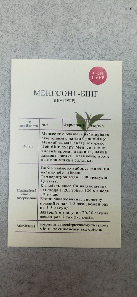Менгсонг Бінг Шу Пуер, Шу пуер, 357г, 2023 - це справжній делікатес серед шу пуерів, особливо якщо він з витриманого листя з гір Менгсонг (Mengsong), що в регіоні Сишуангбанна, провінція Юньнань. Цей чай має не тільки глибокий смак, але й відчутну енергетику.