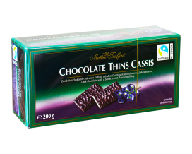 Цукерки Maitre Truffout Chocolate Thins Cassis є тонкими платівками чорного шоколаду з начинкою зі смаком чорної смородини. Прекрасно підійдуть для десерту після легкої вечері та подарують фруктову насолоду у вишуканому темному шоколаді.