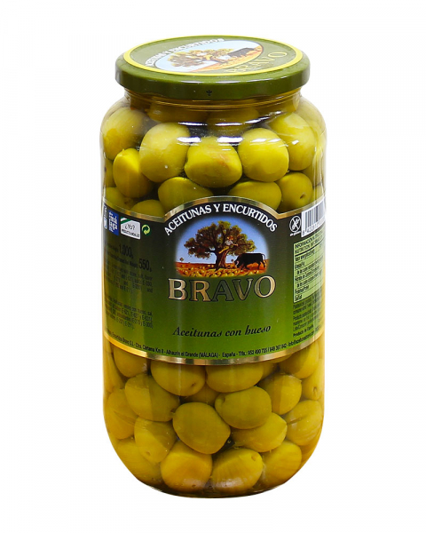 Оливки із кісточкою Bravo Aceitunas con hueso. Оливки мансанилья відомі у всьому світі своїм смаком, текстурою та кольором. Компанія Bravo надає їм особливий, дуже м'який смак, тому оливки ідеально підходять як доповнення до закусок та салатів.