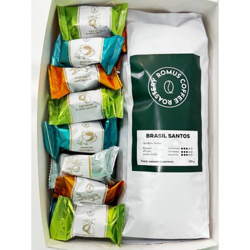 Усередині набору поєднано те, що завжди викликає теплі емоції: ароматну каву та улюблені солодощі. Мелена кава Brasil Santos 500 г — це м’який, збалансований напій із легкими шоколадними нотами та природною солодкістю. Вона ідеально підходить для ранкового пробудження або затишних вечорів із горнятком улюбленої кави.