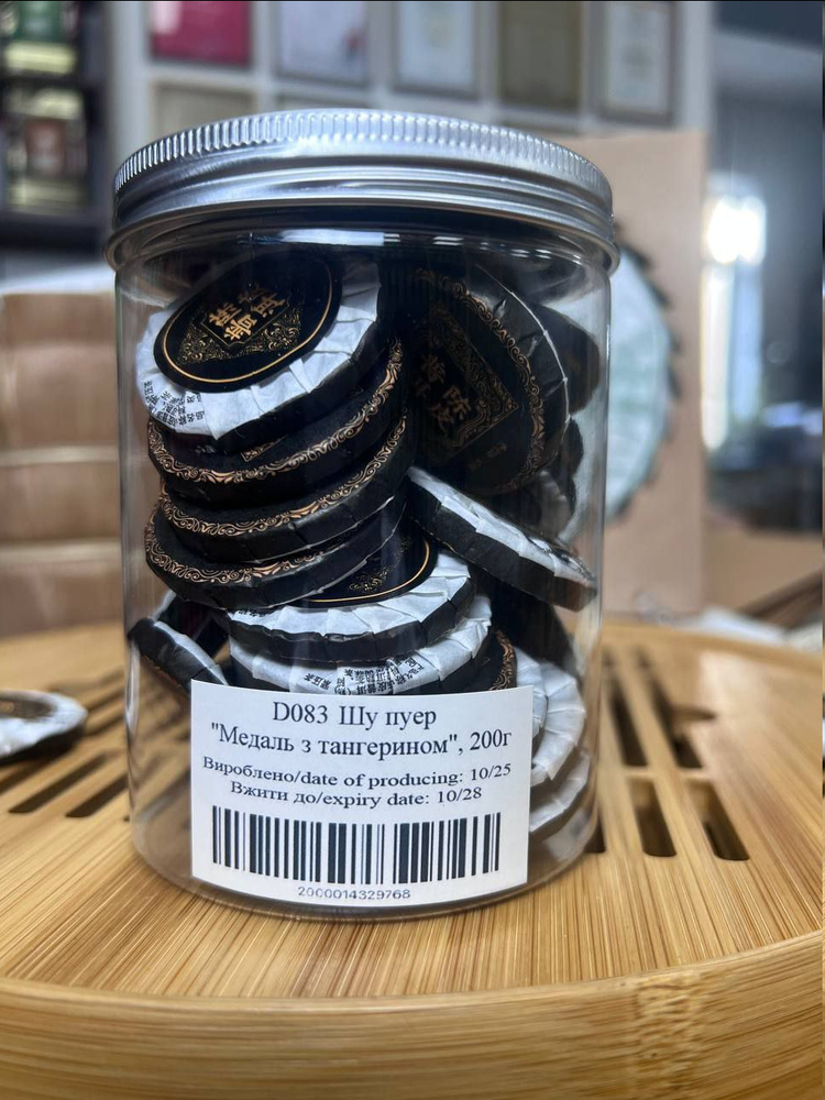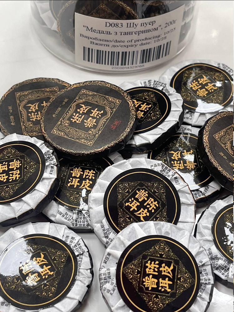 Шу пуер "Медаль з тангерином (мандарин)", 200г - це благородний витриманий чай із глибоким, насиченим смаком та яскравими цитрусовими нотами. Поєднання ферментованого шу пуеру з ароматною шкіркою тангерейна створює унікальний баланс: теплі деревні, горіхові відтінки пуеру доповнюються свіжістю та легкою солодкістю цитрусу.