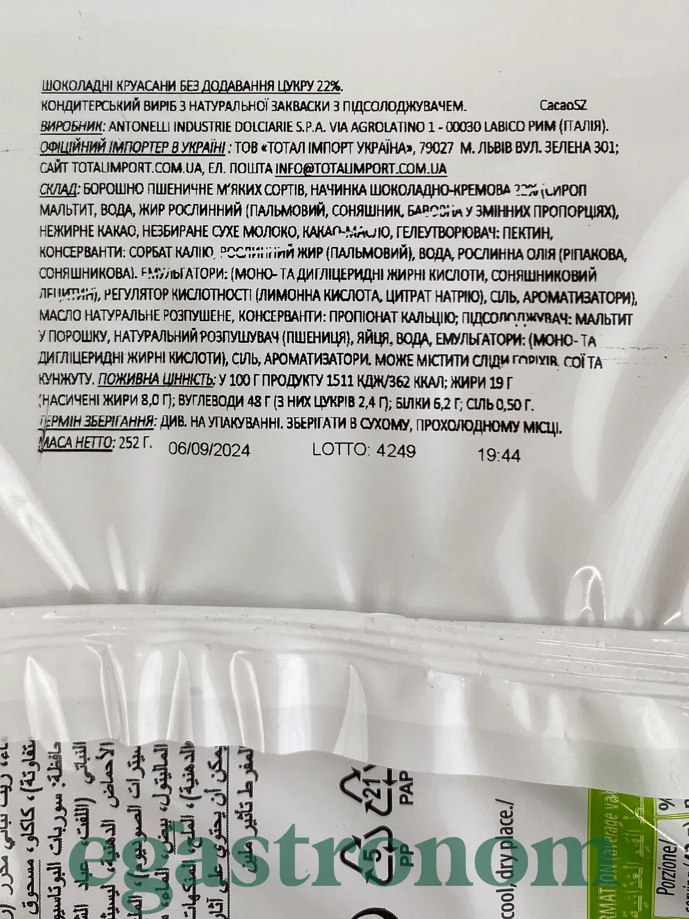 Круасан з шоколадним кремом Антонеллі (Antonelli) - це смачний і ласкавий десерт, що поєднує в собі ніжну випічку круасана і солодкий шоколадний крем. Шоколадний крем усередині круасана густий та солодкий, і він надає десерту інтенсивний шоколадний смак та аромат. Круасан з шоколадним кремом - це солодкий і апетитний десерт для тих, хто цінує поєднання хрусткої випічки та солодкого шоколадного начиння. Це може бути чудовим варіантом для солодких моментів і задоволення вашого прагнення до шоколаду. ТОП запити Засоби по догляду за волоссям купити Порошок купити Дезодорант купити Печиво купити Козій сир Купити пакети для сміття Вітаміни замовити