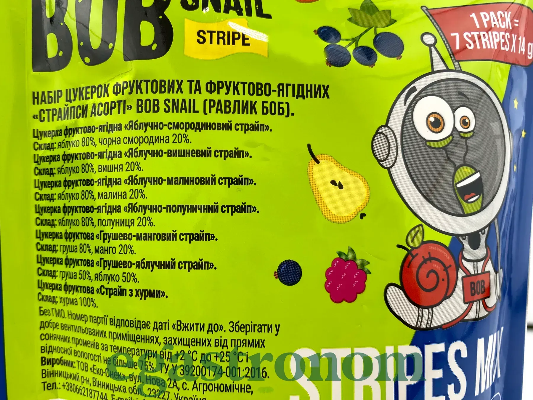 Цукерки натуральні компанії Bob Snail – відмінна альтернатива звичним солодощам. Цей продукт прекрасно підійде як перекус для дитини і швидко зарядить його енергією. Технологія виробництва передбачає використання добірних фруктів і ягід. Вони проходять два етапи обробки і випікаються за низьких температур, це сприяє збереженню яскравого насиченого смаку і комплексу вітамінів, необхідних організму. Можна не турбуватися про алергічні реакції, оскільки у цукерок абсолютно безпечний склад – перетерті фрукти. Вони не містять консервантів, цукру, глютену і барвників. В упаковці 7 страйпсів різних смаків: яблуко-смородина, яблуко-вишня, яблуко-малина, яблуко полуниця, груша-манго, груша-яблуко і хурма. ТОП запити Молоко Купити маскарпоне Камамбер Ціна на олію Твердий сир Засоби і предмети догляду за волоссям Мука борошно