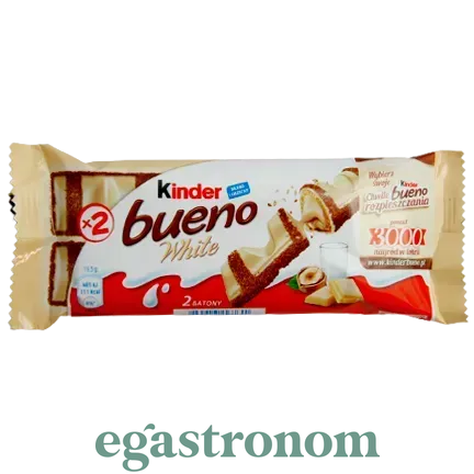 Шоколадний батончик Kinder Bueno White 39гр Легкий і надзвичайно ніжний смак. Хрусткі вафлі з молочно-горіховою начинкою, покриті молочним шоколадом. Легкий та надзвичайно ніжний смак — ось що робить Kinder Bueno таким особливим. ТОП запити Купити порошок Сир з пліснявою купити Моцарелла Сир блакитний лазур з пліснявою Брі сир Молоко Засоби для гоління