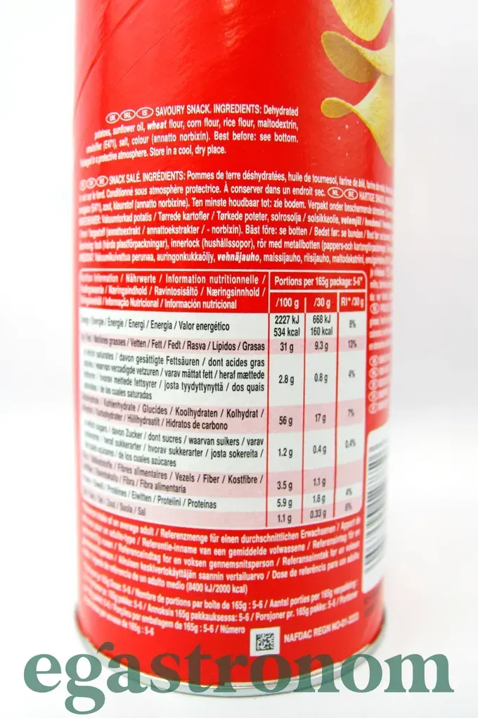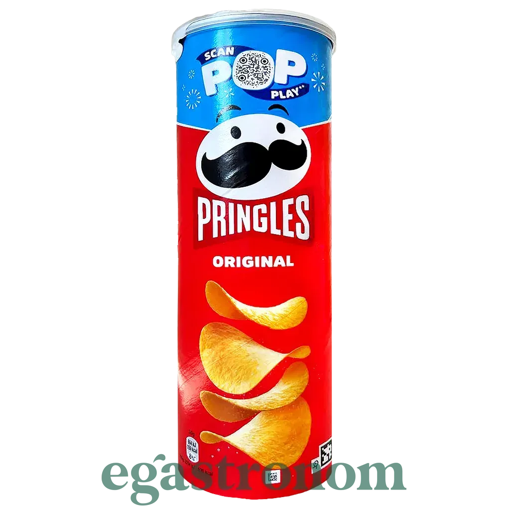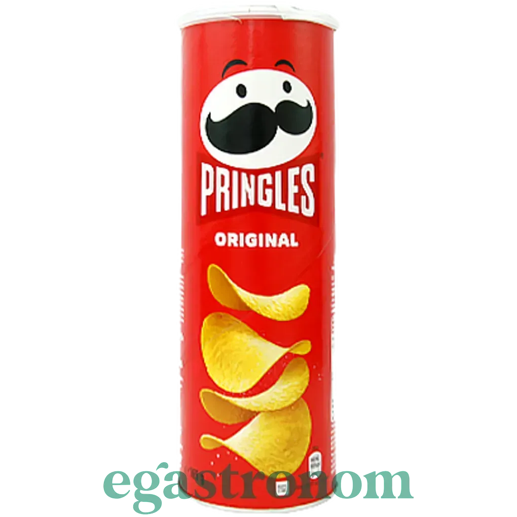 Це традиційні картопляні чипси з додаванням кукурудзяного борошна. Оригінальні – це простий і всім знайомий смак добре прожареної картопельки з сіллю. Цей снек вперше з'явився в 1968 році, а в 2009 році Pringles отримали звання найпопулярніших картопляних чипсів в світі. Одна з особливостей цих чипсів – упаковка. Вони зберігаються в спеціальному тубусі, який захищає їх від пошкоджень і попадання сонячних променів. Кількість на палеті - 1216шт ТОП запити Плавлені сирки Пармезан ціна Товари з європи Побутова хімія ціни Пральний порошок Заправки до салатів Вафлі
