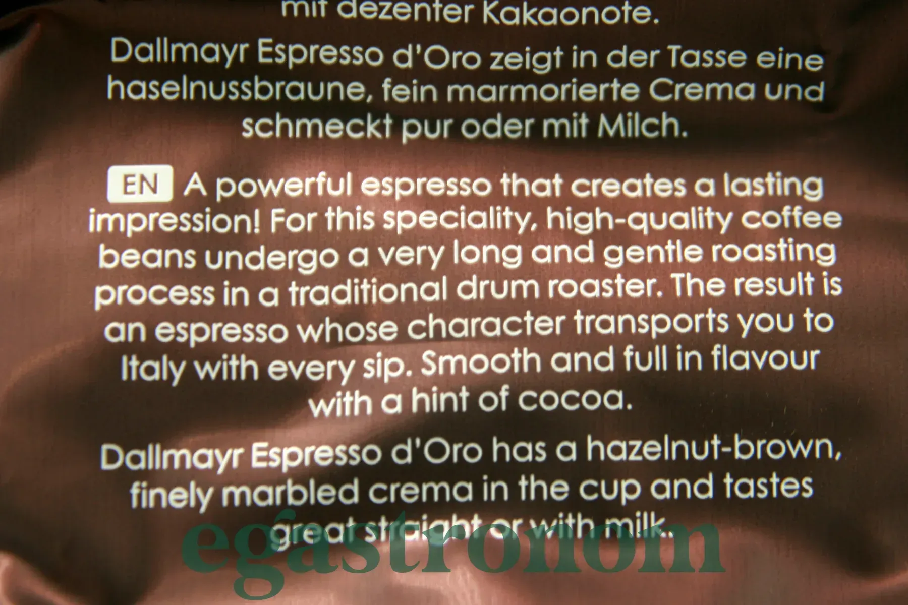 Унікальне поєднання добірних зерен Арабіки і Робусти, приготованих з вишуканим італійським рецептом, з допомогою німецької технології, під чуйним керівництвом і контролем Торгового Дому Dallmayr. Фахівці серйозно і ретельно підходять до процесу приготування зерен Dallmayr Espresso D'oro. Спочатку підбирається найбільш ідеальні за смаком сорти арабіки і робусти, які проходять изрительную перевірку (відбір ідеальних форм зерен). Згодом зерна ретельно і особливо повільно піддаються обжарке, після чого моментально фасуються та запечатуються, що і надає кави Далмаер Еспресо дОро насичений аромат і кремове післясмак, які ідеально підходять для приготування латте і капучіно. Як правило, Dallmayr Espresso D'oro використовується для автоматичних кавоварок. ТОП запити Освіжувач повітря ціна Купити батончики Масло вершкове ціна Ціни на побутову хімію Козячий сир купити Купити енергетики Гелі для душу