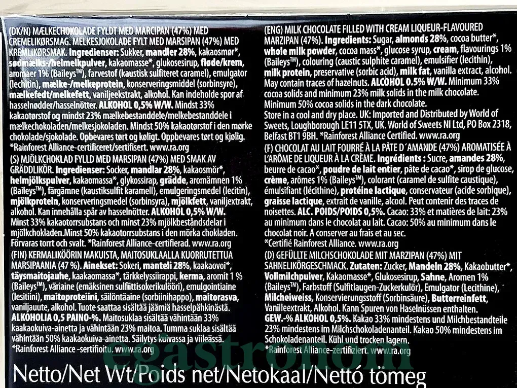Anthon Berg Baileys Treats — це вишукане поєднання ніжного марципану з вершковим смаком ірландського крем-лікеру Baileys, покрите молочним шоколадом з декоративною темною шоколадною спіраллю. ТОП запити Борошняні вироби Господарське мило ціна Плавлений сир ціна Засоби для прибирання Гелі для прання Сир козячий ціна Соєвий соус купити