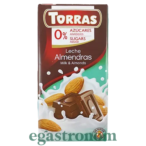 Молочний шоколад з мигдалем (без цукру і без глютену) Torras Milk chocolate with almonds — молочний шоколад з мигдалем. Містить цукрозамінник мальтит, одержуваний з мальтози (солодовий цукор). Є натуральним продуктом, безпечний, на відміну від цукру не викликає карієсу, містить удвічі менше калорій і має низький глікемічний індекс (ГІ = 25-30), що уповільнює процес підвищення рівня глюкози в крові і робить шоколад ідеальним для вживання діабетикам і людям, що вживають продукти з низьким вмістом цукру. ТОП запити Вартість шоколаду Вершки Пральний порошок купити Кетчуп соус Ціна масла вершкового Пакети для мусора Засоби для ванни