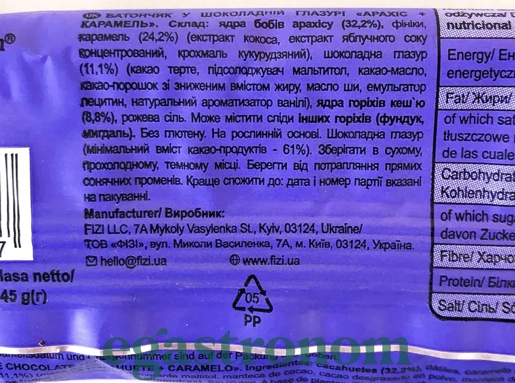 Батончик арахіс карамель (без цукру) Фізі Fizi peanut caramel 45g 10шт/ящ