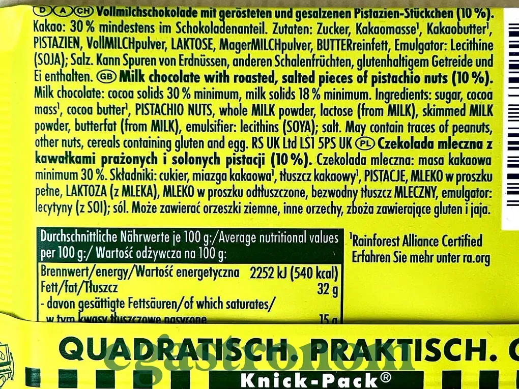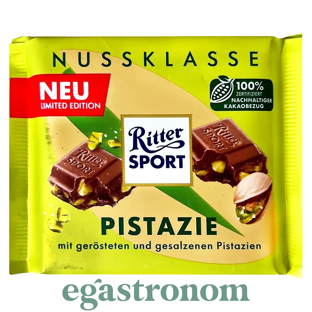 Ritter Sport Pistazie — вишуканий молочний шоколад із обсмаженими та солоними фісташками (10%). Ніжна текстура шоколаду та хрусткі горішки створюють незабутній смак, який точно оцінять гурмани. Цей смак випущено в обмеженій кількості, тому він стане чудовим вибором для тих, хто шукає щось нове та унікальне. Виготовлений із сертифікованого какао Rainforest Alliance. ТОП запити