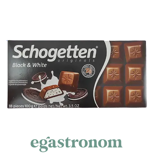 Шоколад Шогеттен 4004 Schogetten black white 100g 15шт/ящ- чудовий молочний шоколад з ніжною ванільно-кремовою начинкою та шматочками хрусткого какао-печива. Шоколад є відмінним способом перекусити, вгамувати голод перед основним прийомом їжі. В упаковці 100 грам, також плитка розділена на маленькі кубики.