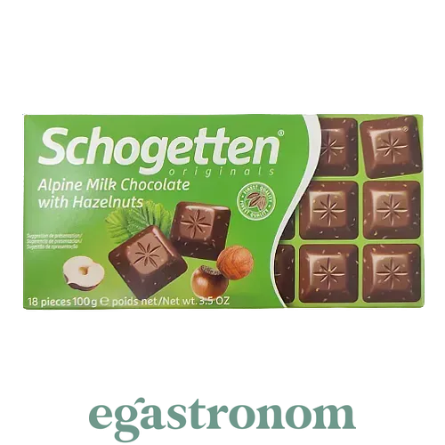 Шоколад Шогеттен 19254 Schogetten alpine milk chocolate with hazelnuts 100g 15шт/ящ- чудовий молочний шоколад з додаванням подрібненого лісового горіха. Виробництво шоколаду Шогеттен бере початок в 1857 року. У складі шоколаду Alpine Milk with Hazelnutsімеет тільки компоненти найвищої якості. В процесі виготовлення шоколаду всі етапи проводяться під суворим німецьким контролем. В коробці шоколаду Schogetten знаходяться 18 смачних солодких квадратика, які покладені в цільну плитку шоколаду, що дозволяє поділитися з друзями і подарує незабутні враження і насолоду від смаку. ТОП запити