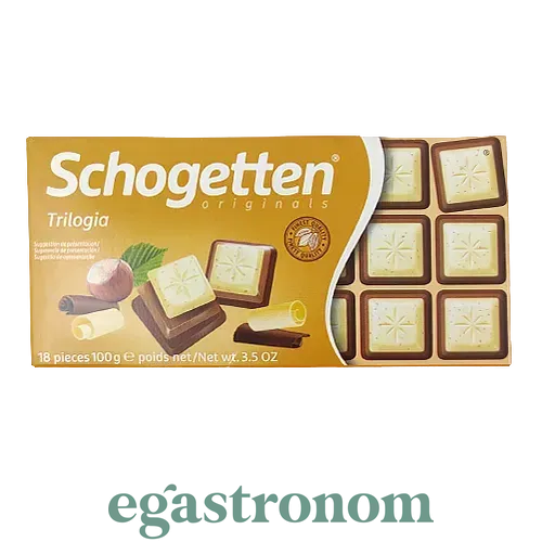 Trilogia Noisettes - триколірний шоколад від німецької марки Schogetten. Це мікс білого і двох видів молочного шоколаду з дрібними шматочками фундука. Складається з трьох шарів: нижній темно-коричневий, середній - світло-коричневий, верхній - білий. Має делікатно ніжний смак, кремовий аромат і незвичайне оформлення. Шоколад Schogetten розділений на 18 однакових порцій, які нагадують маленькі опуклі цукерки квадратної форми. На кожній з них вибиті візерунок у формі зірочки. ТОП запити