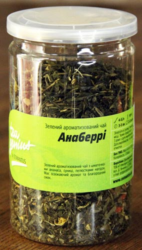 Ароматизированный зеленый чай "Анаберри" с кусочками ананаса, земляники, лепестками подсолнуха. Имеет освежающий аромат и благородный вкус.