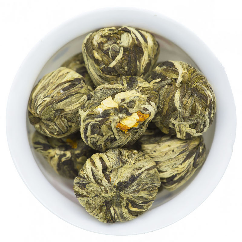Уникальный китайский вязаный чай "Белая красавица", который распускается при заваривании в изящный белый цветок. Жасминовые цветы и белая хризантема сделали его вкус свежим и насыщенным, а высокое содержание теина – тонизирующим.