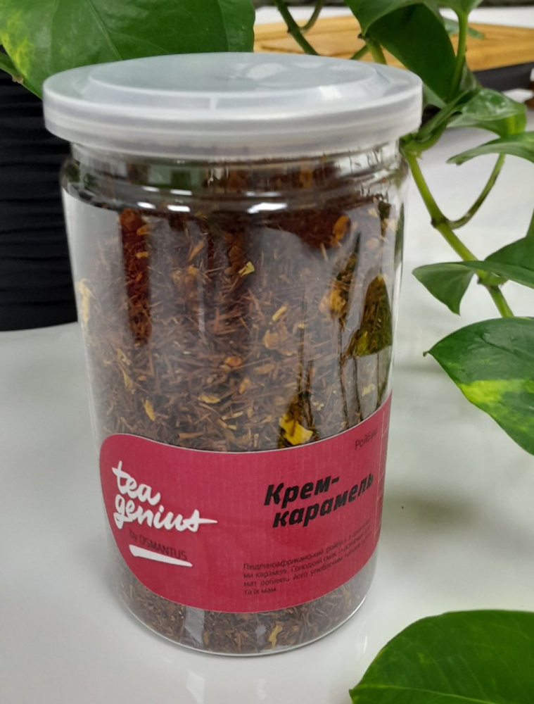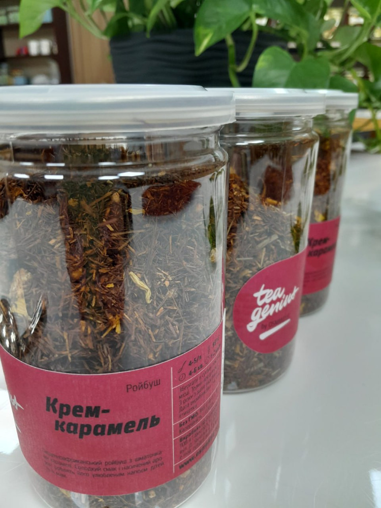 Південноафриканський ройбуш "Крем-карамель" з шматочками карамелі. Солодкий смак і насичений аромат роблять його улюбленим напоєм дітей та їх мам.
