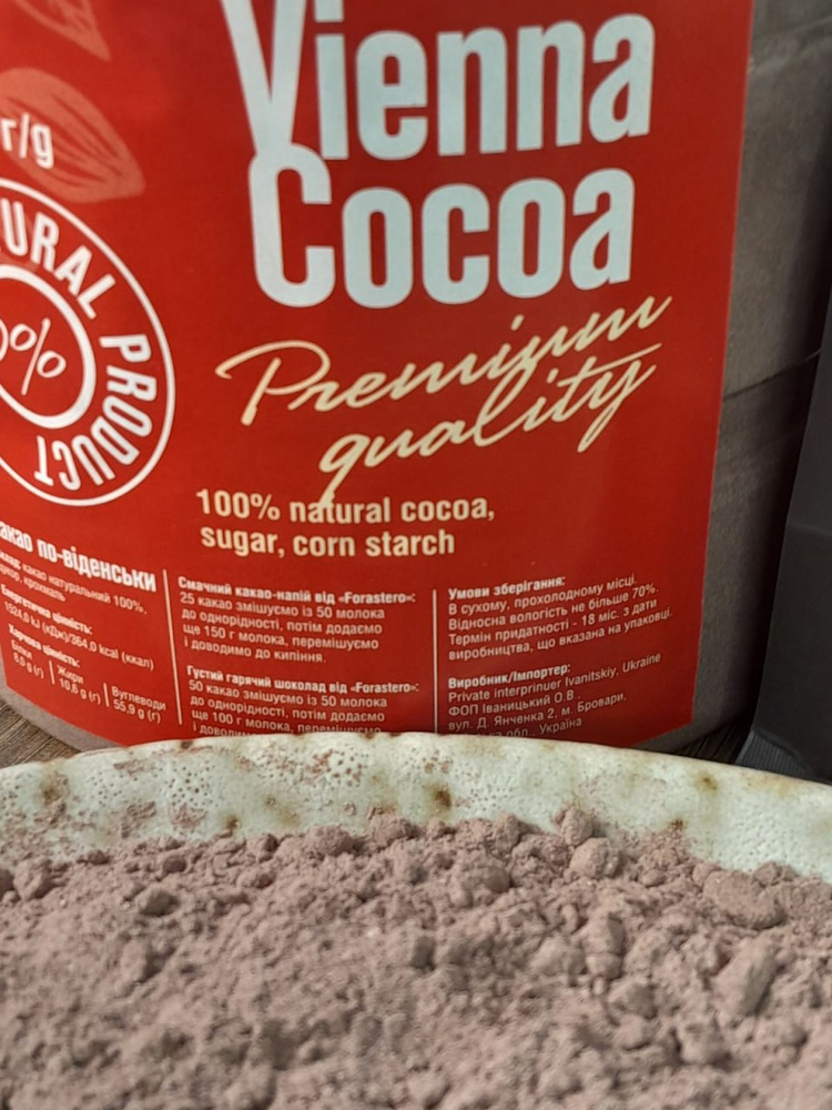 Склад: Какао натуральний 100%, цукор, крохмаль. Енергетична цінність: 1524,0 kJ (кДж) / 364,0 kcal (ккал) Харчова цінність: Білки: 8 g (г), жири: 10,6 g (г), вуглеводи: 55,9 g (г) Умови зберігання: У сухому, прохолодному місці. Видности вологість не хворій 70%. Термін придатності - 18 міс. з дати виробництва, вказаної на упаковці. Способи приготування: Смачний какао-напій від "Forastero": 25 г какао Змішуємо з 50 мл молока до однорідності, потім додаємо ще 150 г молока, перемішуємо і доводимо до кипіння. Густий гарячий шоколад від "Forastero": 50 г какао змішуємо з 50 мл молока до однорідності, потім додаємо ще 100 мл молока, перемішуємо і доводимо до кипіння.