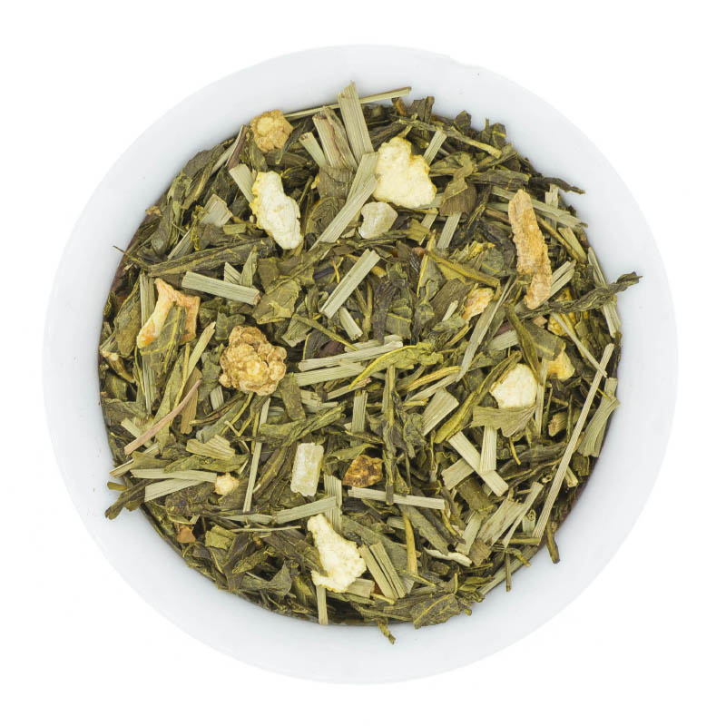 Зелений чай Гінкго-чай - це ароматизований зелений чай з лимонною травою, листям гінкго, цедрою апельсина та коренем женьшеню.