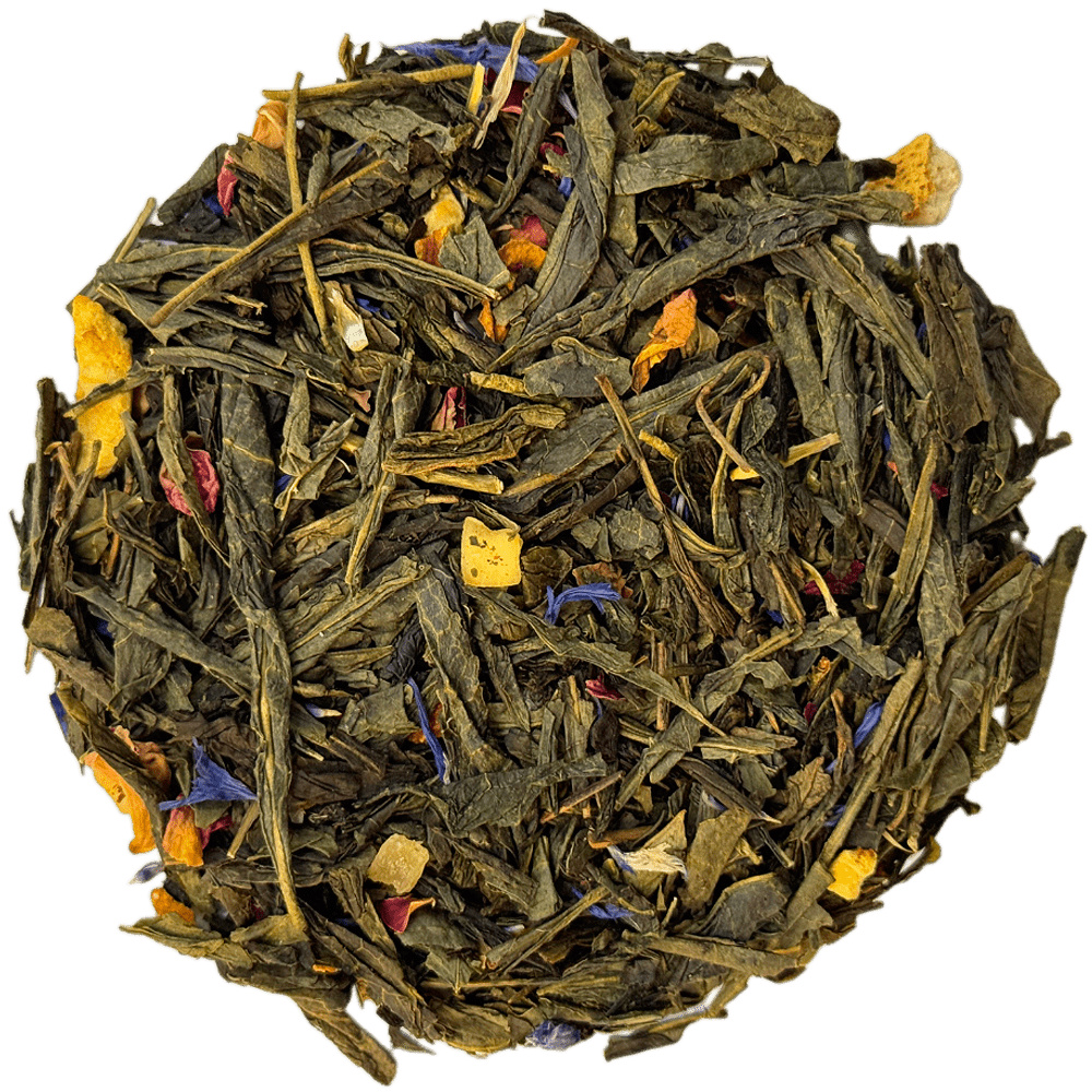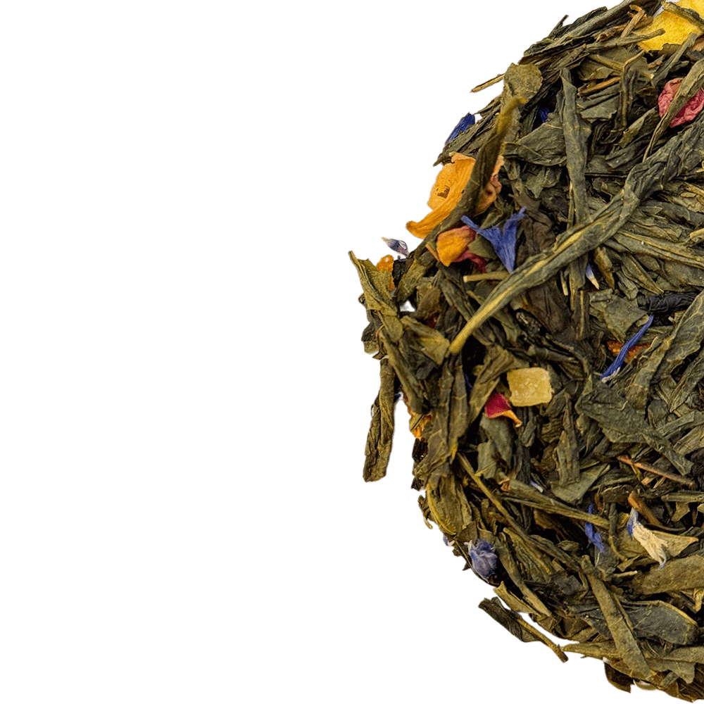 Зелений чай, цукати папайї, ананасу, пелюстки троянди, волошка, цедра апельсину.