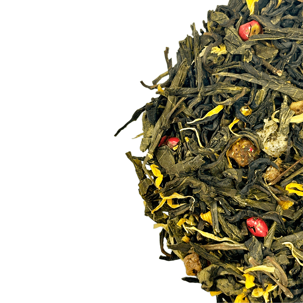 Зелений чай ароматизований шматочками імбиру і рожевим перцем (відомими своїм ефектом спалювати жир), шматочками папайї, пелюстками чорнобривців і сафлору. Ефективно втамовує спрагу і, одночасно, зігріває в холоднечу.