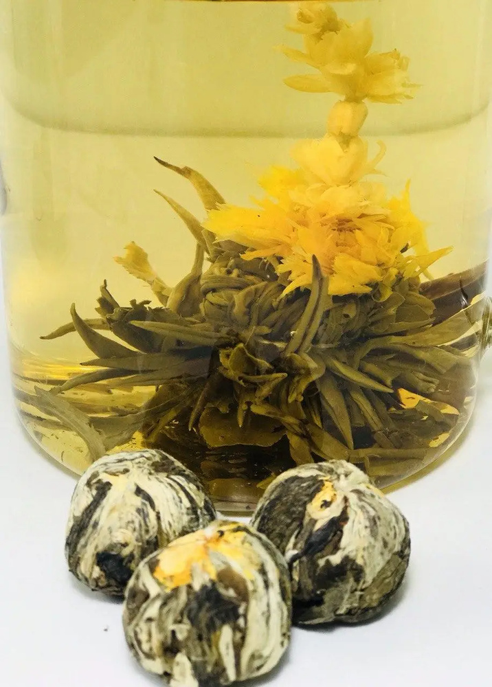 Незвичайний зв'язаний чай – вершина всього чайного мистецтва. За його чарівне перетворення зі звичайної кульки в чудову квітку, що розкрилася, чай отримав другу назву – квітучий. Якщо правильно такий чай заварити, він справді повільно перетворюється на дивовижну квітку.